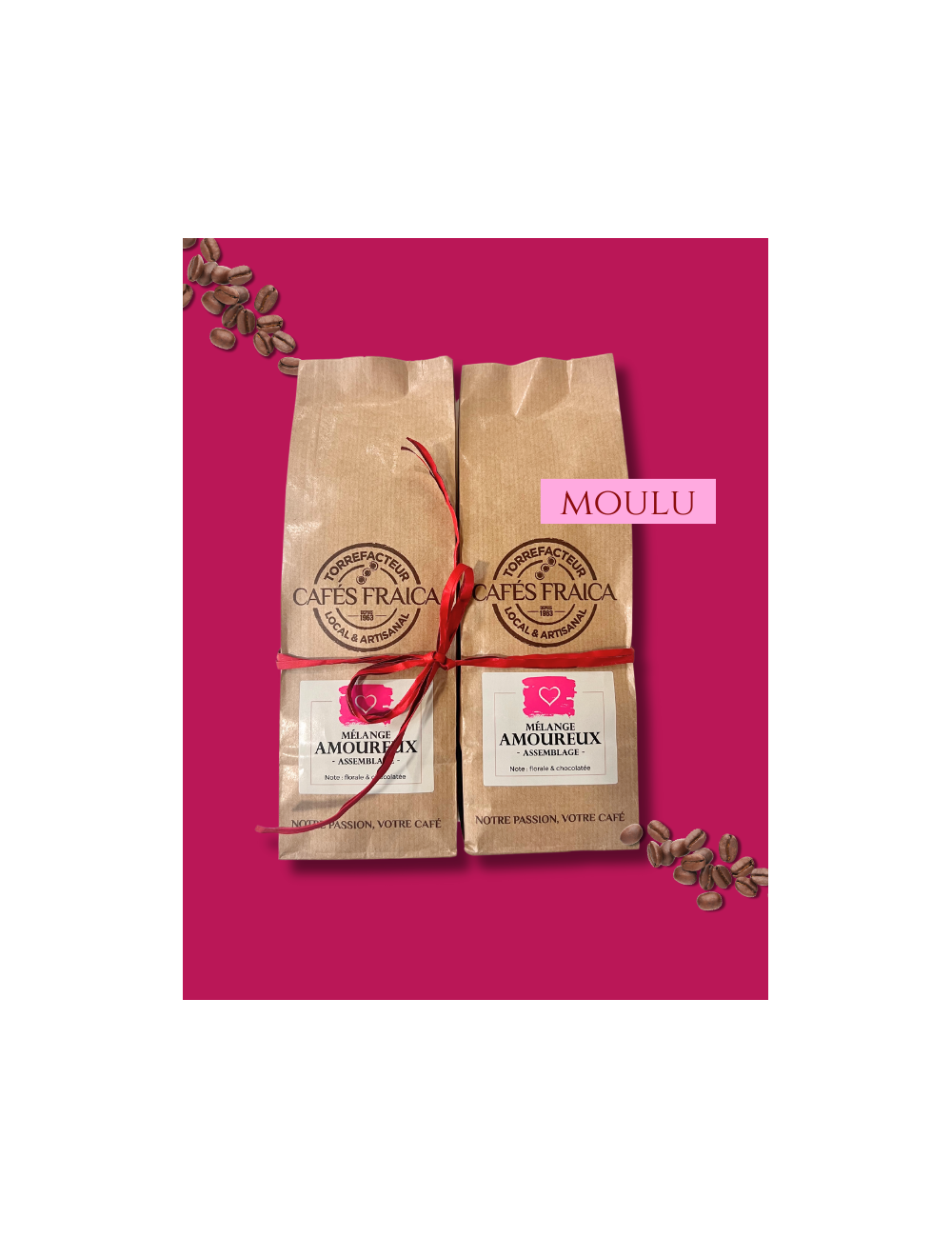 Pack Mélange Amoureux – café moulu : 2 sachets de 250g d’un assemblage 100% Arabica, avec un profil aromatique floral et chocolaté, idéal pour partager une pause café avec sa moitié.